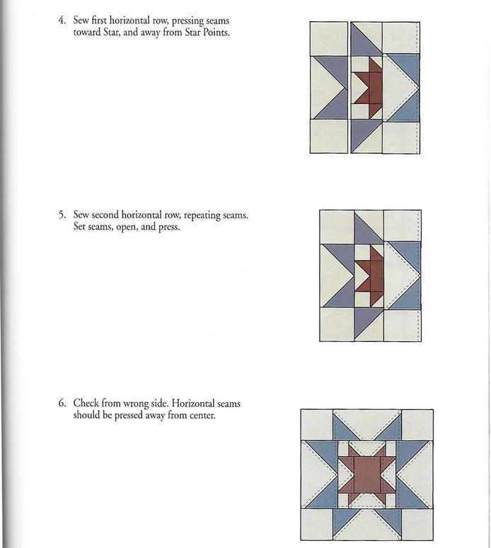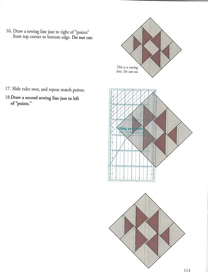 if you do not have the special ruler required to make the Flying Geese as the directions are given here, I have alternative cutting directions for the 12" block. Make your Flying Geese by drawing a diagonal line on the squares and then sewing them to each end of the rectangle. Here are the cutting directions: