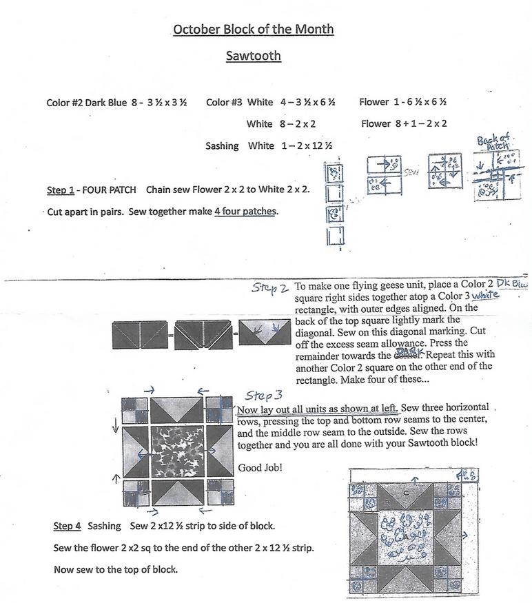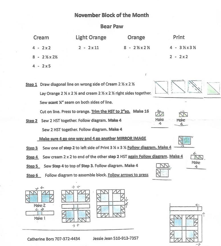 Each month you make two blocks using the materials kit provided by Catherine Bors. One block goes into the Block Of The Month drawing at the General Meeting and the other block will be used to make a Community Service quilt. We are asking for a $2 donation that can be returned when you turn in your completed blocks. Or you can donate the $2 towards BOM supplies